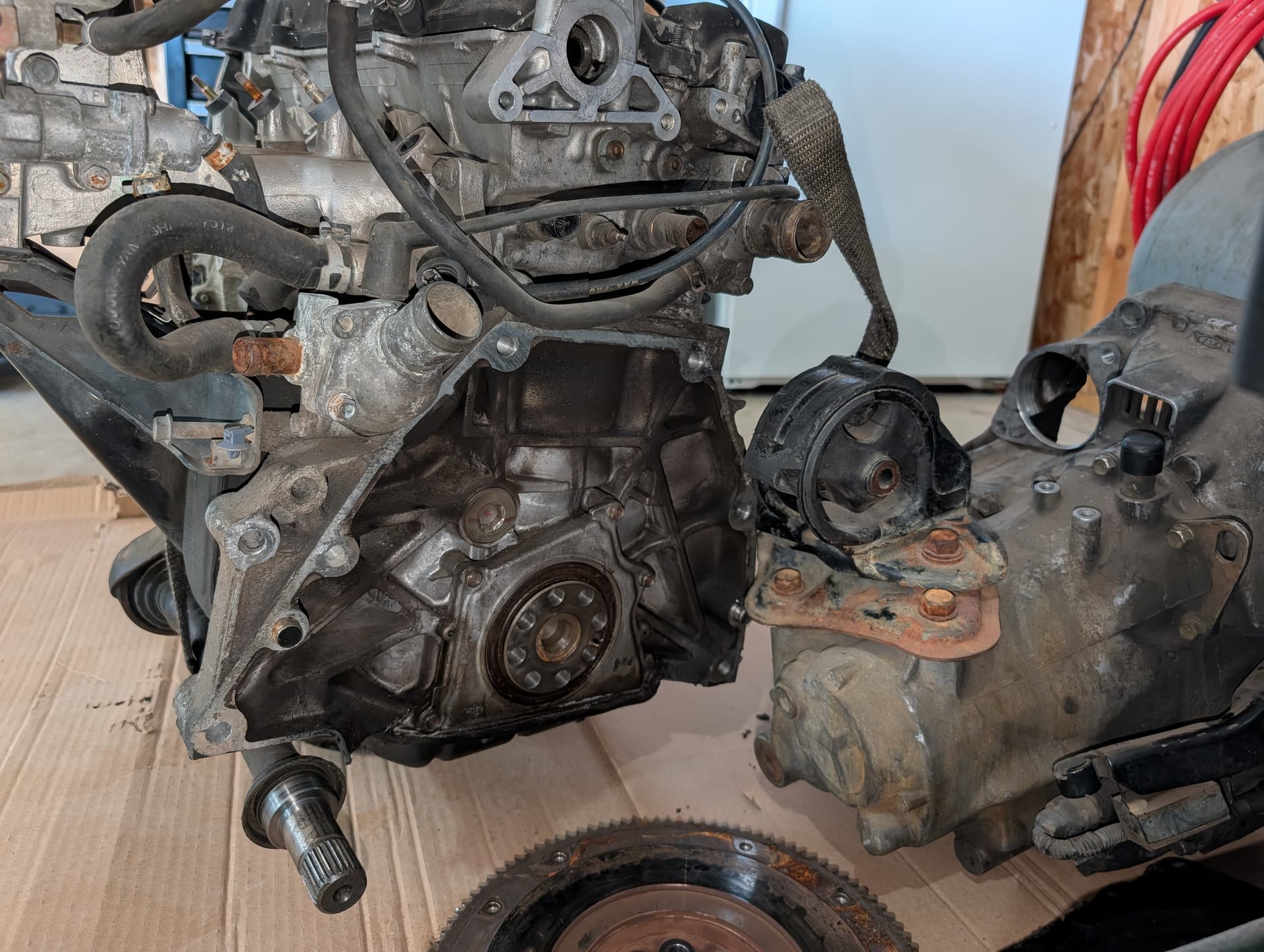 Engine and trans are secured. Trans seems good. Engine seems ok but I’m just gonna keep my original one in the car since it runs great.