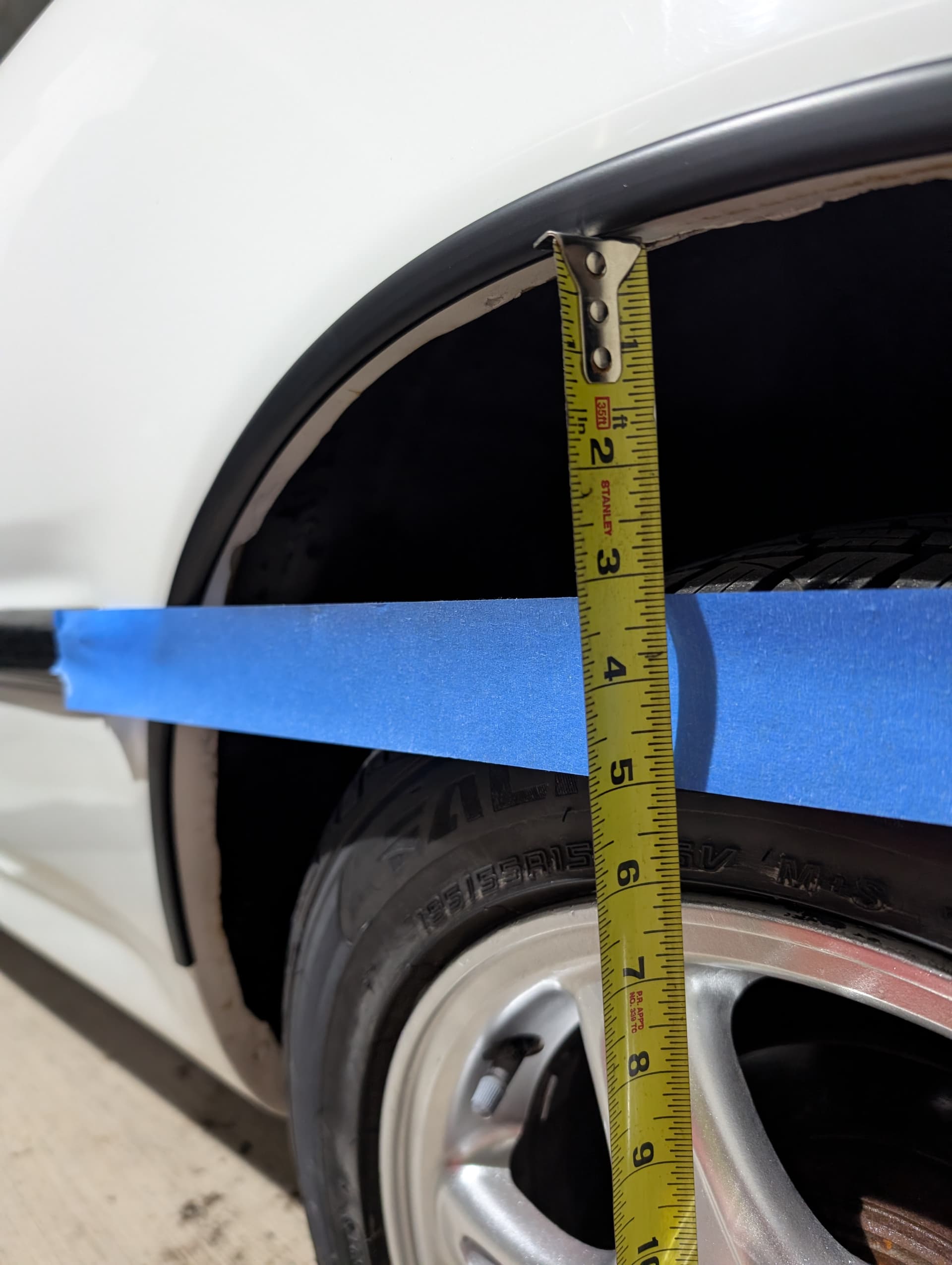 Also, I tried unloading my rear suspension bolts and re-tightening under load, but did not get the rear end any lower. Can someone run a string or a straight edge across the top of their trim and measure to the highest point in their rear wheel arch? I want to compare mine with an intact rear wheel arch.