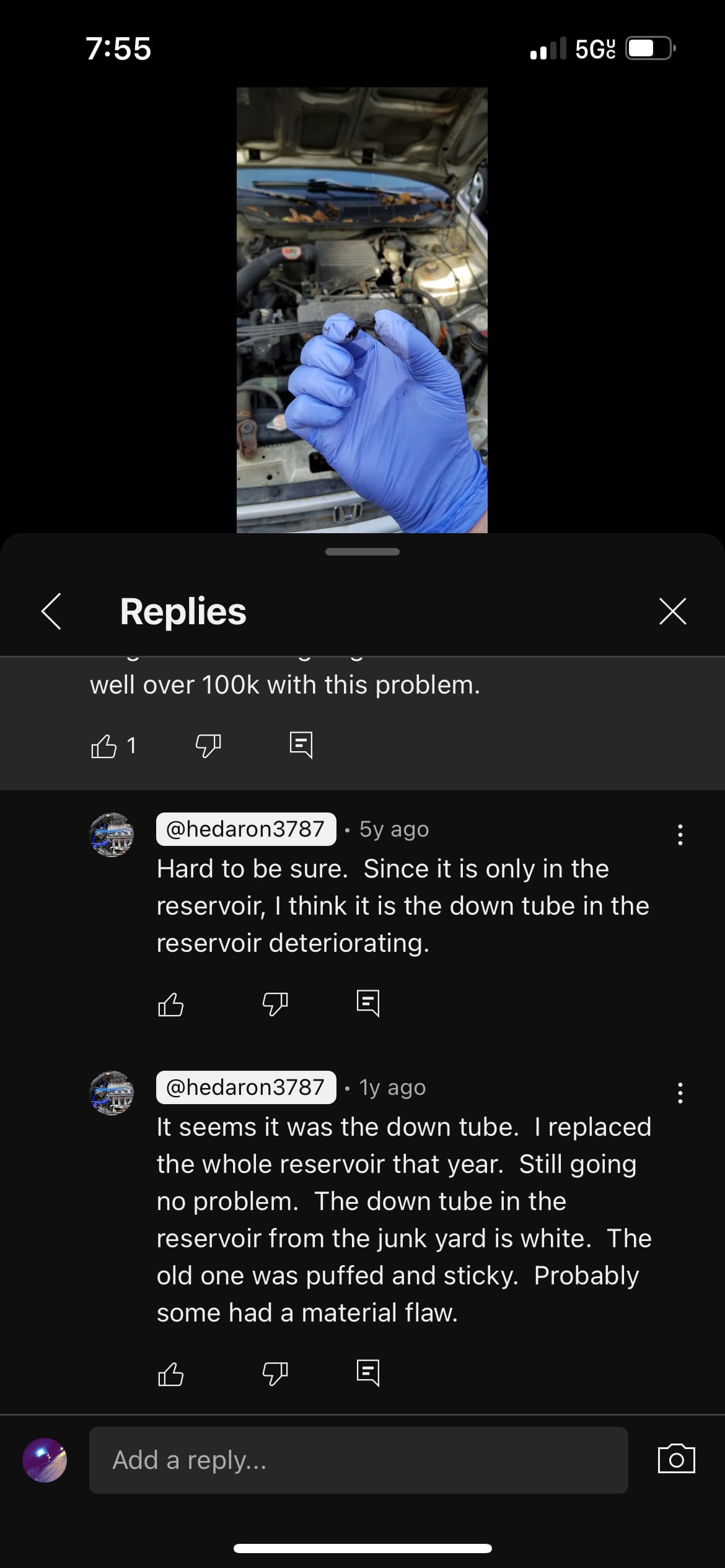 i topped it off and drove around and the coolant is still nice and blue in the reservoir i wonder what that sticky black stuff is from ?this guy said he also just had sticky tar in the reservoir tank and he replaced the pick up tube and it solved the problem…anyone had this experience?